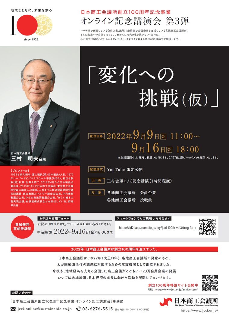 3. 日本商工会議所創立100周年記念事業 オンライン講演会(第3弾)「変化への挑戦(仮)」のご案内