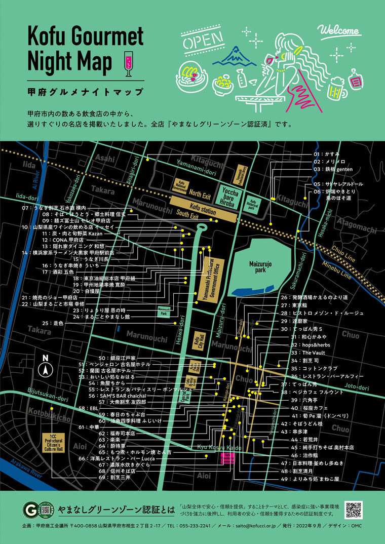 甲府市内の数ある飲食店の中から、選りすぐりの名店を掲載した『甲府グルメナイトマップ』を作成しました。