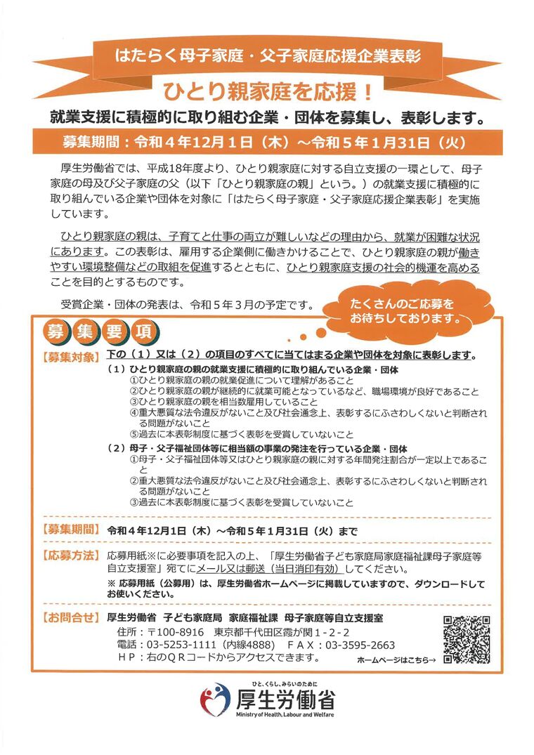 【厚生労働省】令和4年度「はたらく母子家庭・父子家庭応援企業表彰」の公募を開始します