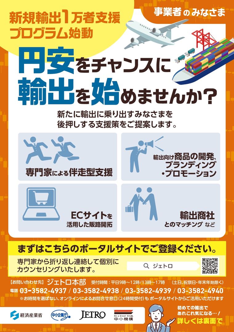 【ジェトロ】「はじめて輸出」を応援します「新規輸出1万者支援プログラム」