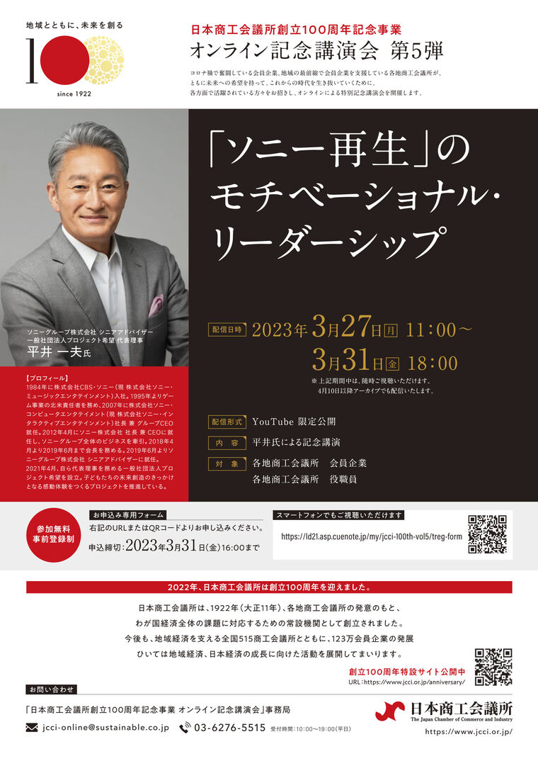 日本商工会議所創立100周年記念事業 オンライン講演会(第5弾)「『ソニー再生』のモチベーショナル・リーダーシップ」のご案内
