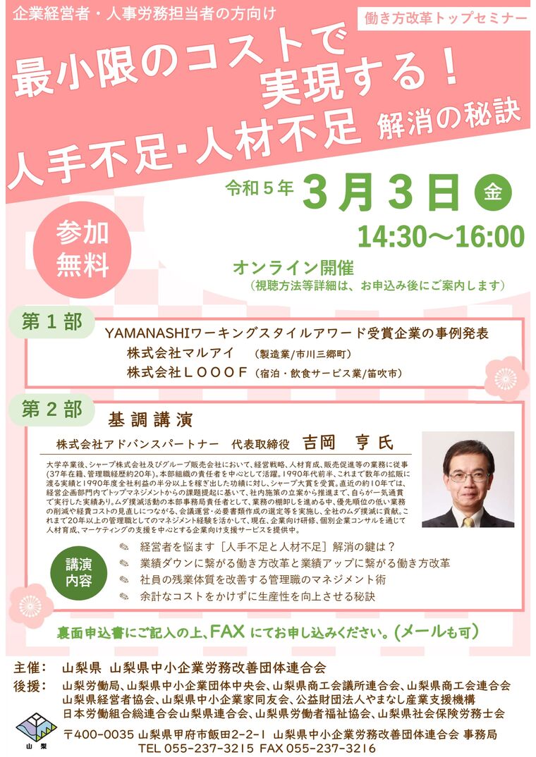 働き方改革に取り組む県内中小企業等の経営者や人事・労務管理の実務担当者の皆さまを対象としたセミナーを開催します。