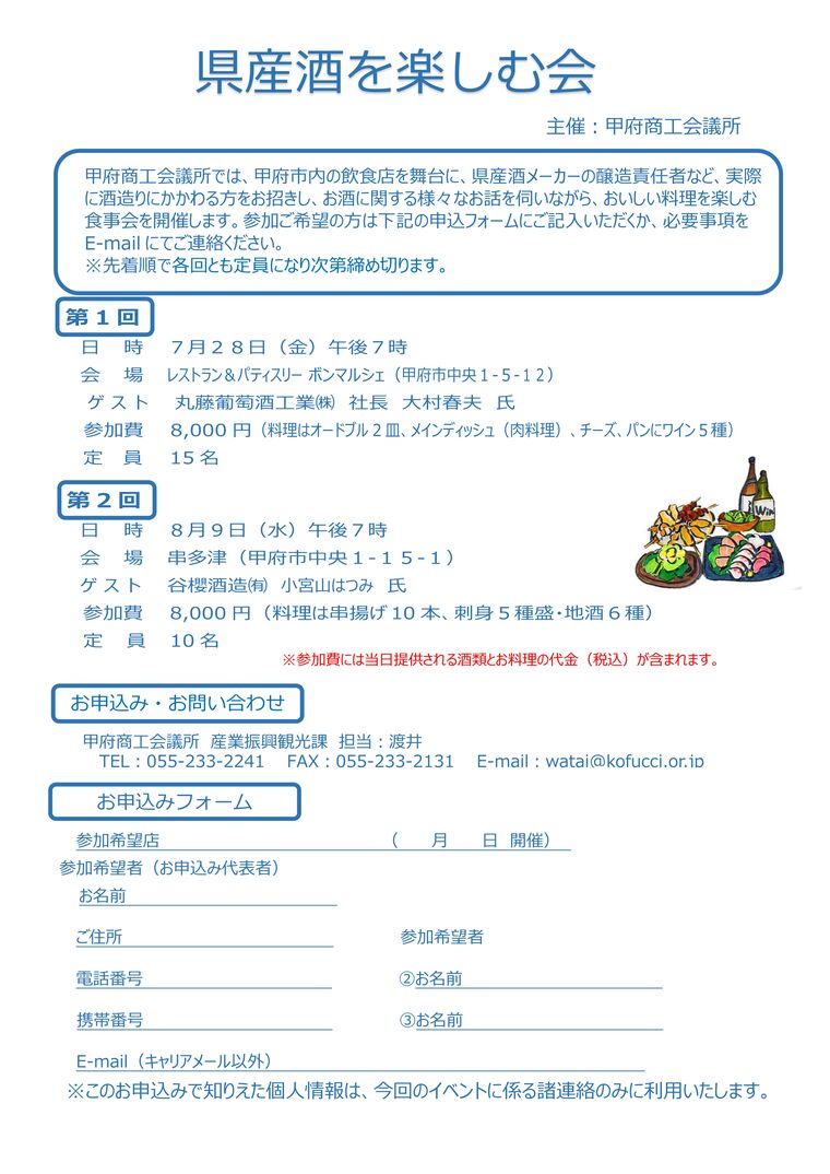 ※先着順で各回とも定員になり次第締め切ります。日 時 7月28日(金)午後7時 場 所 レストラン&パティスリー ボンマルシェ(甲府市中央1-5-12) ゲ ス ト 丸藤葡萄酒工業㈱ 社⾧ 大村春夫 氏 参 加 費 >8,000 円(料理はオードブル 2 皿、メインディッシュ(肉料理)、チーズ、パンにワイン5種) 日 時 8月9日(水)午後7時 場 所 串多津(甲府市中央1-15-1) ゲ ス ト 谷櫻酒造㈲ 小宮山はつみ 氏 参 加 費 8,000 円(料理は串揚げ 10 本、刺身5種盛・地酒6種)