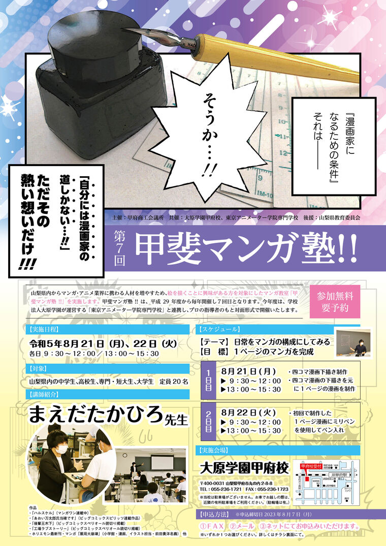 夏休みの定番となったマンガ教室「甲斐マンガ塾!!」を今年も開講いたします!