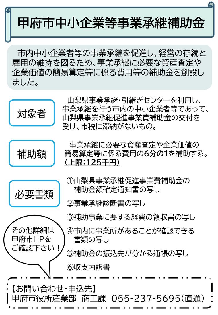 ○対象者:山梨県事業承継・引継ぎセンターを利用し、事業承継を行う市内の中小企業者等であって、山梨県事業承継促進事業費補助金の交付を受け、市税に滞納がないもの。