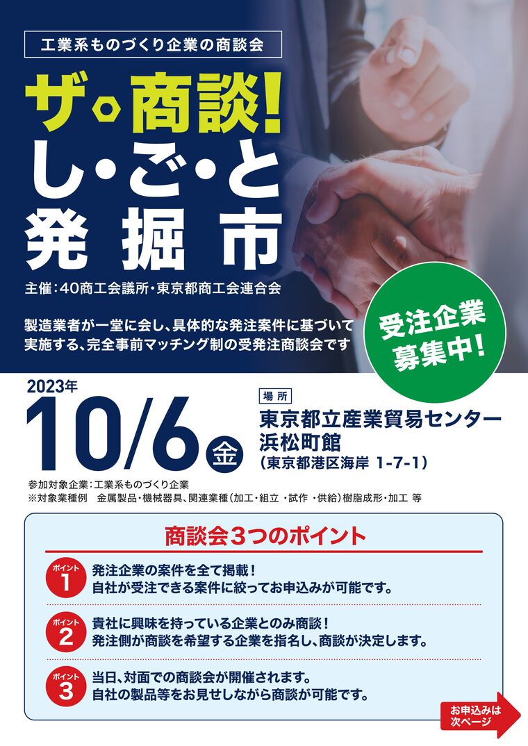 ザ・商談!し・ご・と発掘市は、関東近県を中心とした1都2府15県から40の商工会議所及び東京都商工会連合会が主催となって、製造業者が一堂に会し、具体的な案件に沿って個別に面談いただく受発注商談会です。