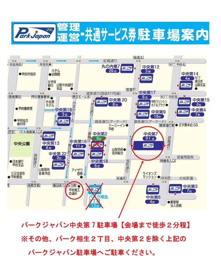※指定駐車場…地図上の○印「パークジャパン中央第7駐車場(約90台・徒歩2分)」