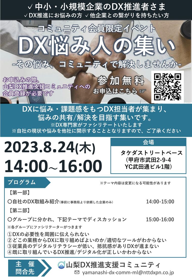 【8/24】「DX悩み人の集い -その悩み、コミュニティで解決しませんか-」の開催について【山梨DX推進支援コミュニティ】