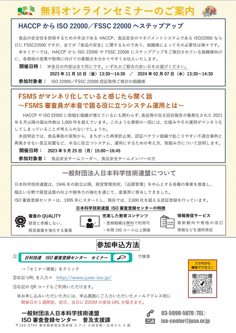 本セミナーでは、HACCPからISO 22000やFSSC 22000にステップアップをご検討されている組織様向けに、それぞれの規格の違いや認証取得に向けての着眼点を分かりやすくお伝えいたします。