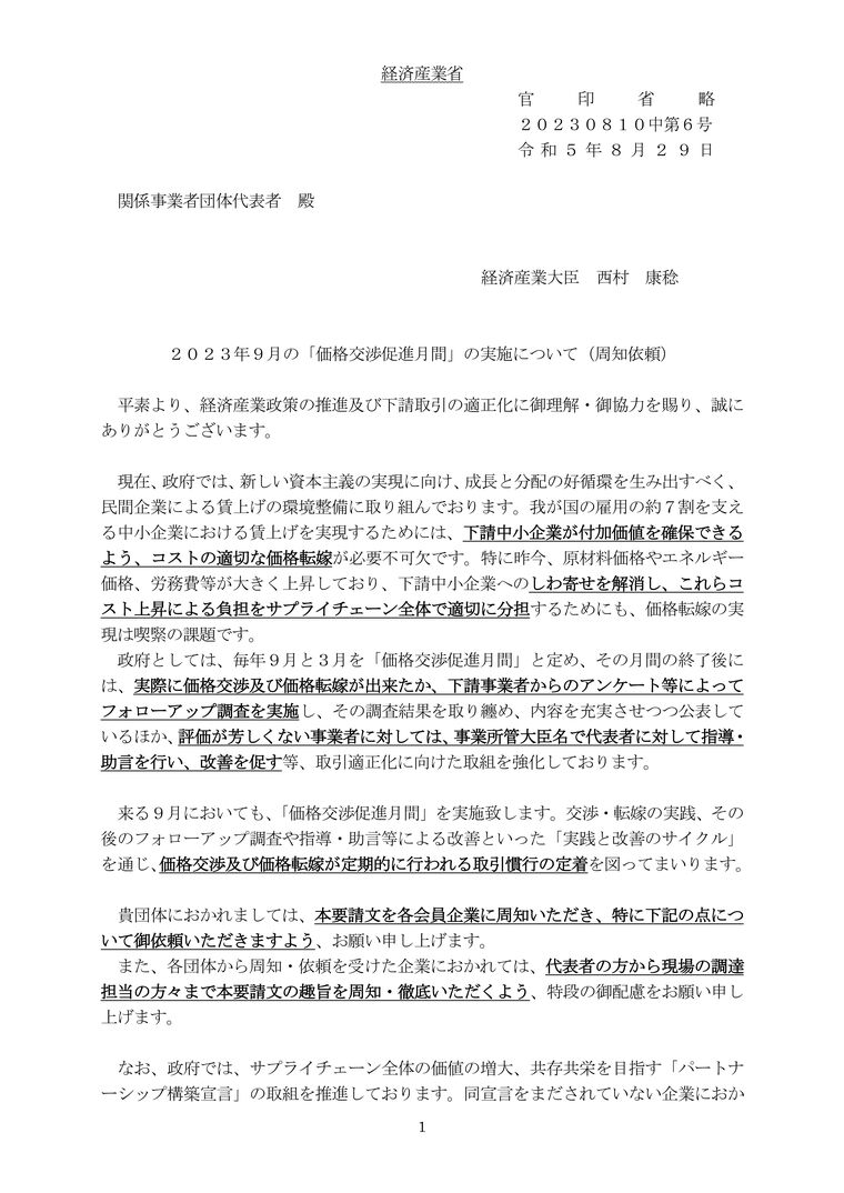 来る9月においても、「価格交渉促進月間」を実施致します。交渉・転嫁の実践、その後のフォローアップ調査や指導・助言等による改善といった「実践と改善のサイクル」を通じ、価格交渉及び価格転嫁が定期的に行われる取引慣行の定着を図ってまいります。