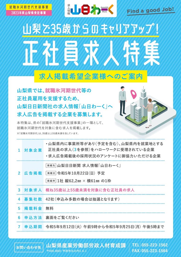 山梨県では、就職氷河期世代等の正社員雇用を支援するため、山梨日日新聞の求人情報「山日わーく」へ求人広告を掲載する企業を募集します。