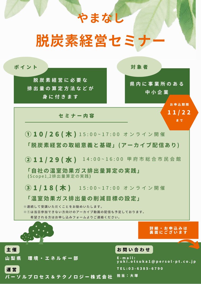 ※今年度、これから脱炭素経営に取り組む始めようと検討されている県内の中小企業の皆様を対象に、全3回の「やまなし脱炭素経営セミナー」を実施させていただくこととしました。是非、積極的にご参加ください。以下のURLより、申し込みフォームにアクセスいただき、お申込みください。申し込み