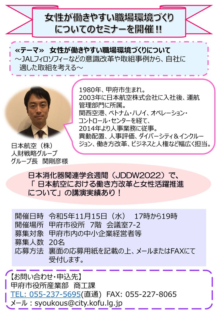 日 時 令和5年11月15日(水)17時~19時 場 所 甲府市役所7回会議室7-2 テ ー マ 女性が働きやすい職場環境づくりについて 募集対象 甲府市内の中小企業経営者など 参加方法 参加申込書に必要事項を記載の上、メールまたはFAXにて送信 定 員 20名 主 催 甲府市 問合せ先 甲府市役所産業部 商工課