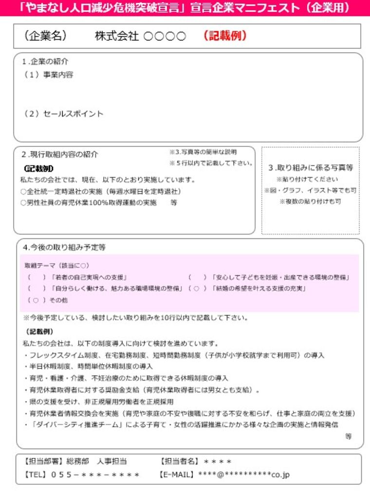 山梨県では、企業の『やまなし人口減少危機突破共同宣言』マニフェストを募集しています。