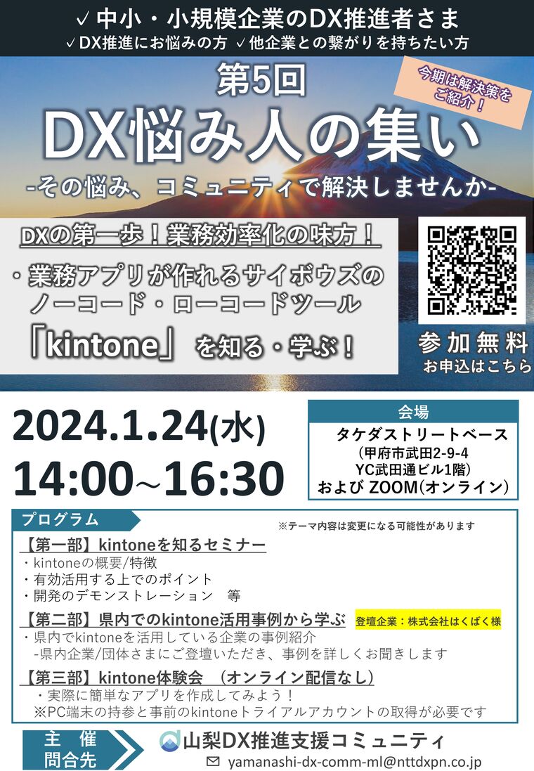 会場:タケダストリートベース (甲府市武田2-9-4)【第一部】kintoneを知るセミナー内容