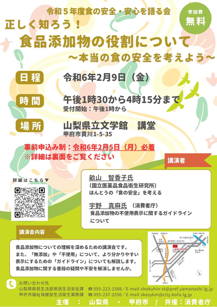 山梨県ならびに甲府市では、「正しく知ろう!食品添加物の役割について~本当の食の安全を考えよう~」と題し、食品添加物についての理解を深めるための講演会を実施します。講師は国立医薬品食品衛生研究所 畝山先生をお招きし、[ほんとうの「食の安全」を考える]をテーマに、ご講演いただくと共に、消費者庁担当補佐からは令和6年3月31日までが表示の見直し期間とされている「食品添加物の不使用表示に関するガイドライン」について解説していただきます。