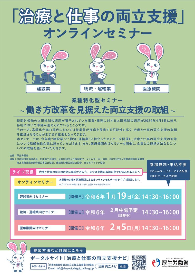 視聴のための詳しい御案内はポータルサイト「治療と仕事の両立支援ナビ」(https://chiryoutoshigoto,mhlw.go.jp/)にてお知らせいたします。