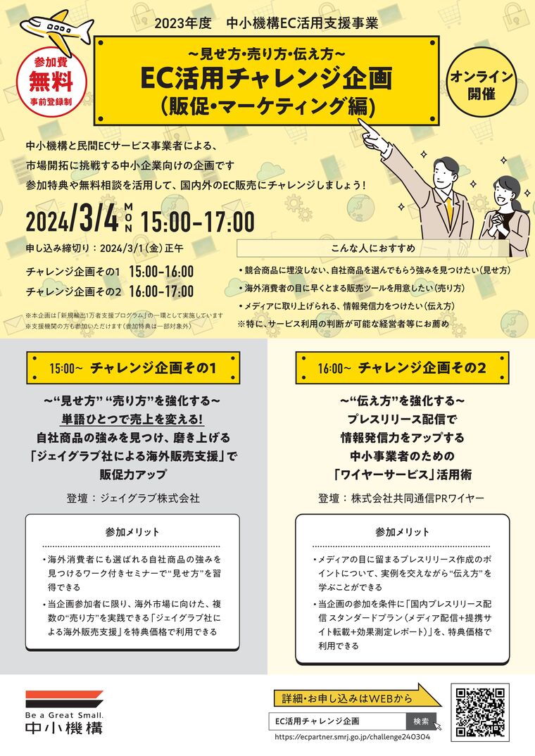 ※特に、サービス利用の判断が可能な経営者等にお薦めです。参 加 費 無 料 申込期限 2024年3月1日(金)正午 詳細・申込み https://ecpartner.smrj.go.jp/challenge240304/ 主 催 等 主催:独立行政法人中小企業基盤整備機構