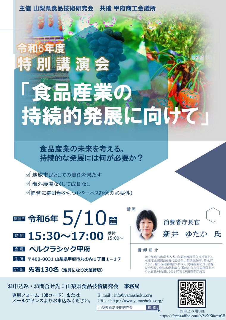 ご多用のところ恐縮ではございますが、参加のご検討をお願い致します。日 時 令和6年5月10日(金)15:30~17:00 場 所 ベルクラシック甲府 テ ー マ 「食品産業の持続的発展に向けて」 参加方法 申込フォームよりお申込み 定 員 130名 主 催 山梨県食品技術研究会(共催:甲府商工会議所) 問合せ先 山梨県食品技術研究会事務局