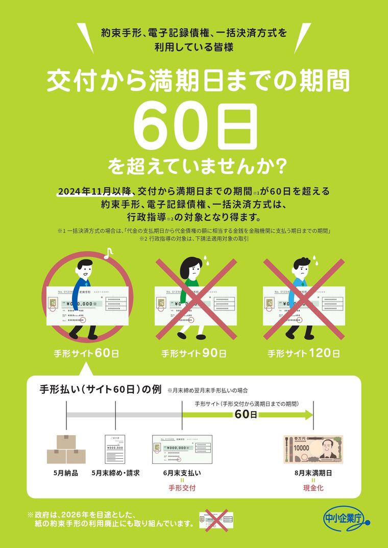 中小企業庁では、中小企業の取引適正化の重点課題の1つに「支払条件の改善」を位置づけ、業種別の下請ガイドラインや自主行動計画などを通じ、約束手形、電子記録債権、一括決済方式による下請代金支払のサイト(交付から満期日までの期間※1)の短縮を推進してきました。2024年11月以降、下請法上の運用が変更され、サイトが60日を超える約束手形や電子記録債権の交付、一括決済方式による支払は、行政指導の対象となります。