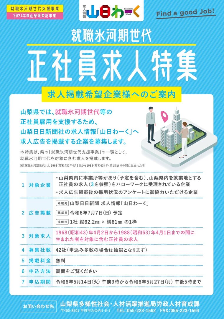山梨県では、就職氷河期世代等の正社員雇用を支援するため、山梨日日新聞の求人情報「山日わーく」へ求人広告を掲載する企業を募集します。