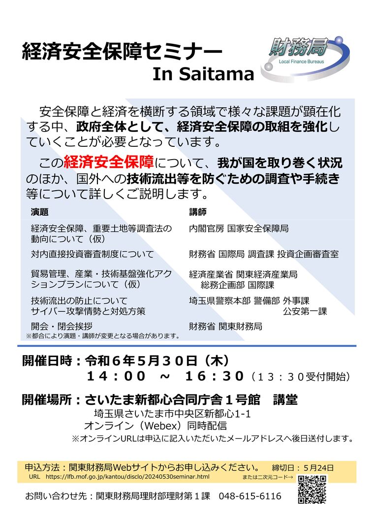 この経済安全保障について、我が国を取り巻く状況 のほか、国外への技術流出等を防ぐための調査や手続き等について詳しくご説明します。日 時 令和6年5月30日(木)14:00 ~ 16:30(13:30受付開始) 場 所 さいたま新都心合同庁舎1号館 講堂またはオンライン 参加方法 https://lfb.mof.go.jp/kantou/disclo/20240530seminar.htmlから申し込み