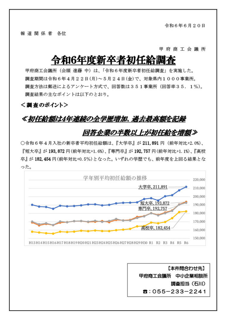 令和6年度初任給調査結果がまとまりましたので報告いたします。詳細は下記のリンクをご確認ください。