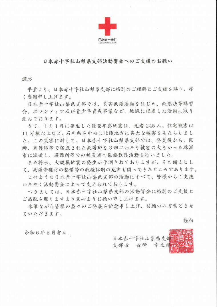 つきましては、日本赤十字社山梨県支部の活動資金に格別のご支援とご高配を賜りますよう衷心よりお願い申し上げます。