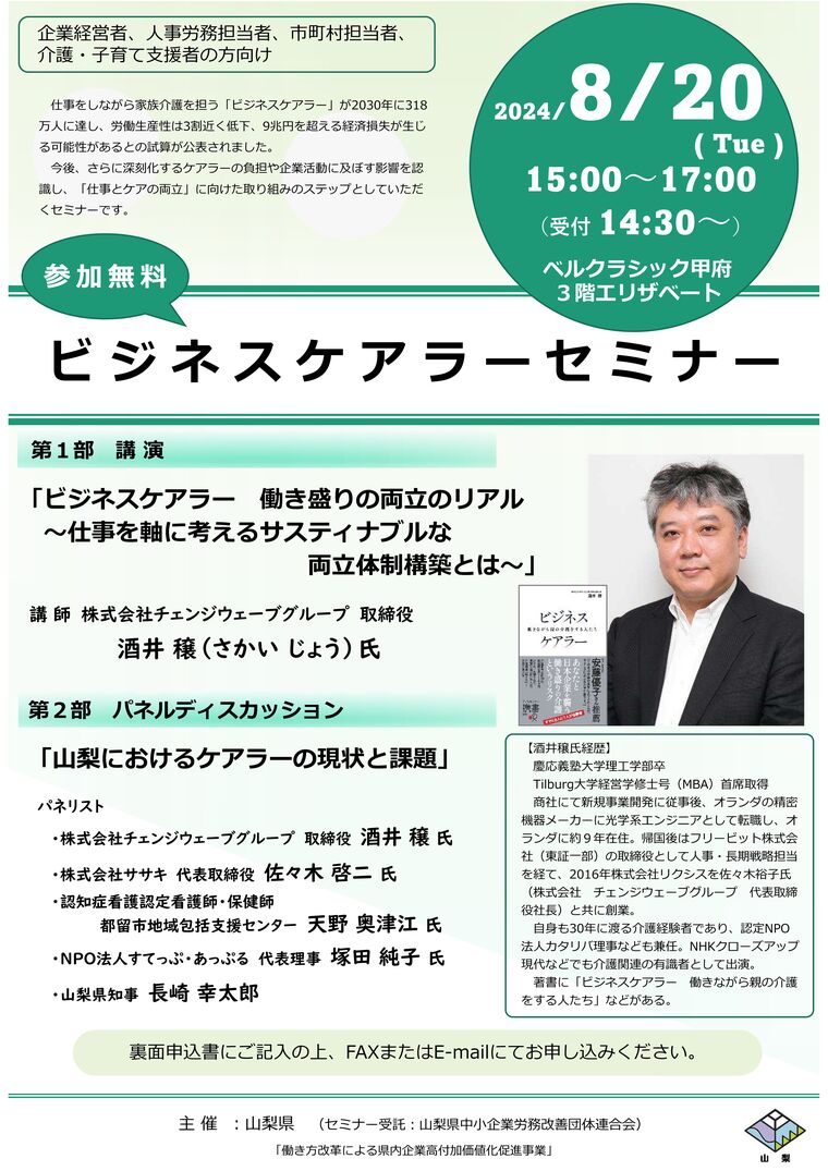 第二部 パネルディスカッション「⼭梨におけるケアラーの現状と課題」参加方法 申込書にご記⼊の上、FAXまたはE-mailにてお申し込みください。 参 加 費 無料 主 催 山梨県(セミナー受託︓⼭梨県中⼩企業労務改善団体連合会) 問合せ先 山梨県中小企業労務改善団体連合会 事務局