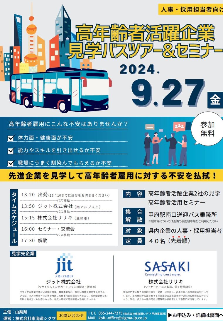 山梨県では、高年齢者雇用の促進を図るため、県内企業の人事・採用担当者等を対象に、高年齢者活躍企業見学バスツアー&セミナーを開催します。