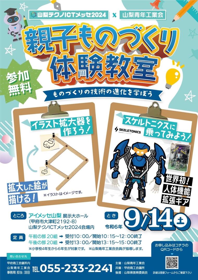 午後の部:13:00(受付)/13:15~16:00開催場所 アイメッセ山梨 展示大ホール(甲府市大津町2192-8)山梨テクノICTメッセ2024会場内 応募対象 山梨県内の小学生4~6年生(保護者同伴でお願いします) 定 員 午前の部・午後の部各20組 応募方法 申込フォーム(Googleフォーム)からお申し込み下さい 実施団体 主催:山梨青年工業会