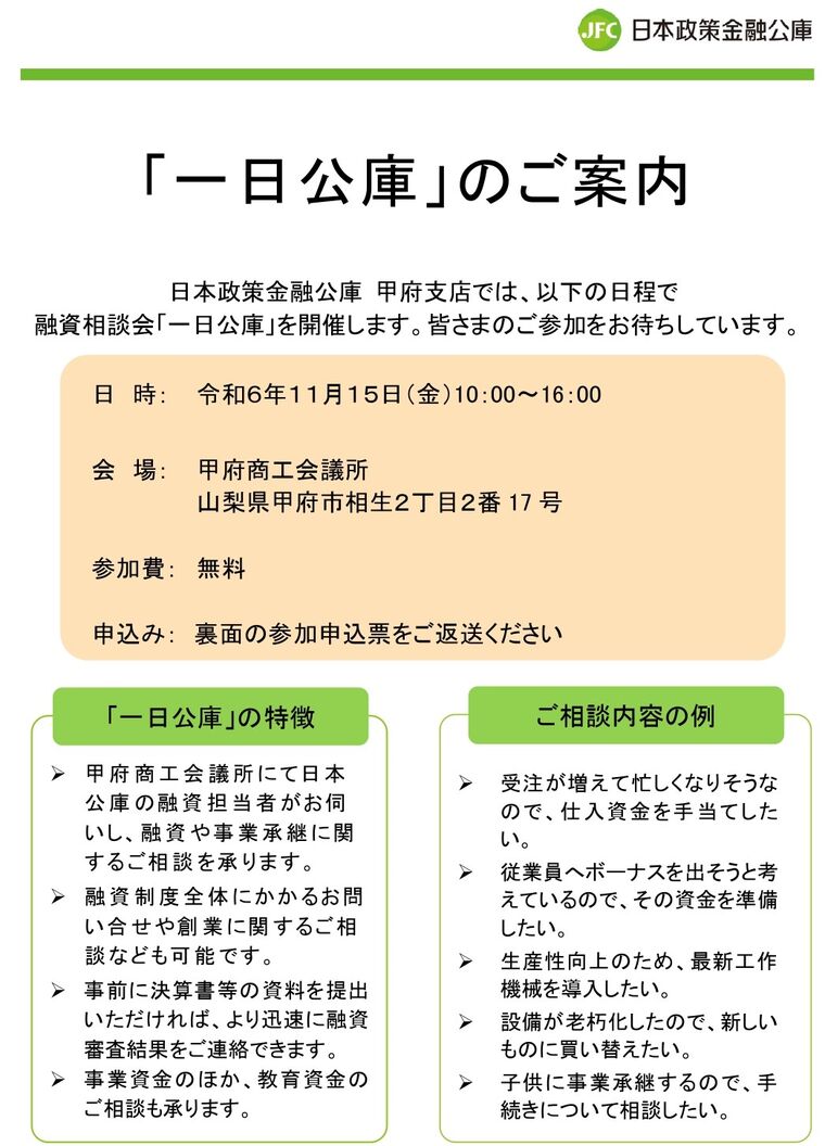 お客様が日本政策金融公庫の担当者に、直接その場で融資を受けられるかどうかを相談できるというサービスです。一日公庫とは