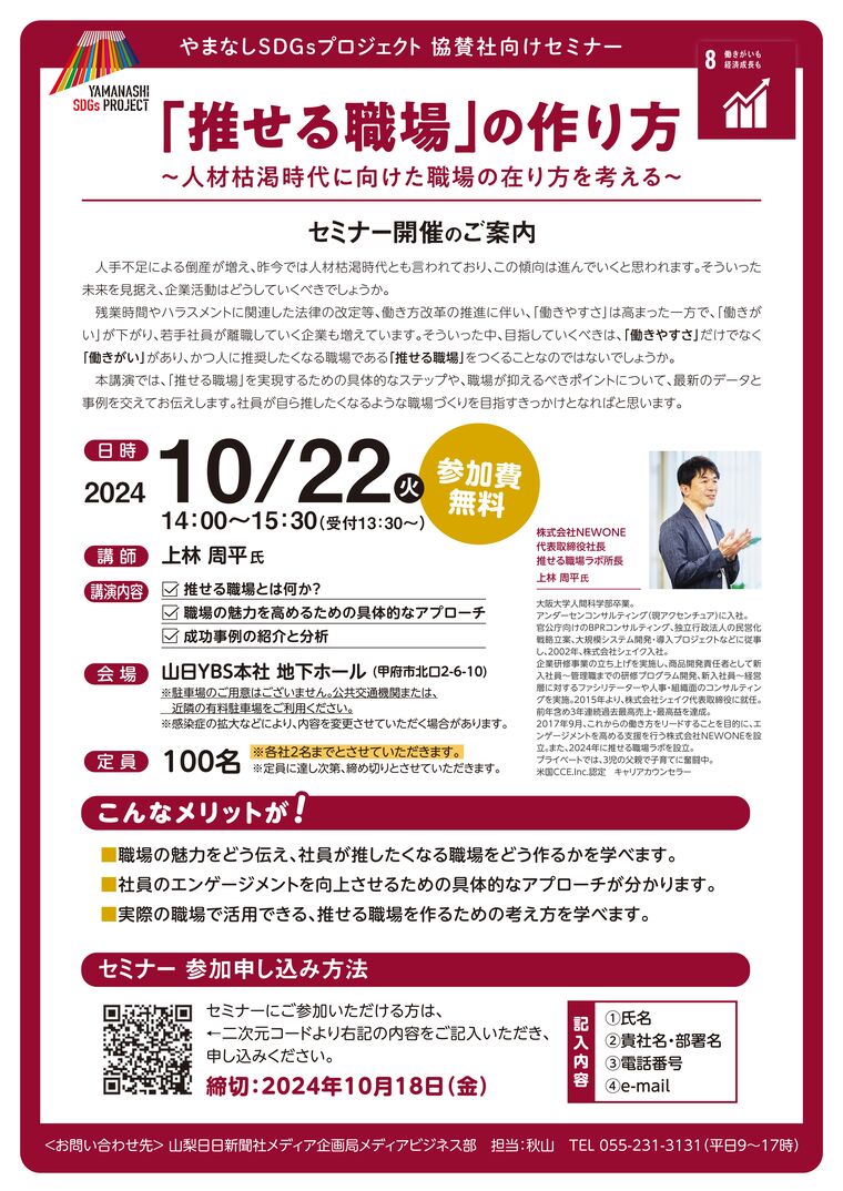 日 時 2024年10月22日(火)14:00-15:30 場 所 山日YBS本社 地下ホール(甲府市北口2-6-10) テ ー マ 「推せる職場」の作り方