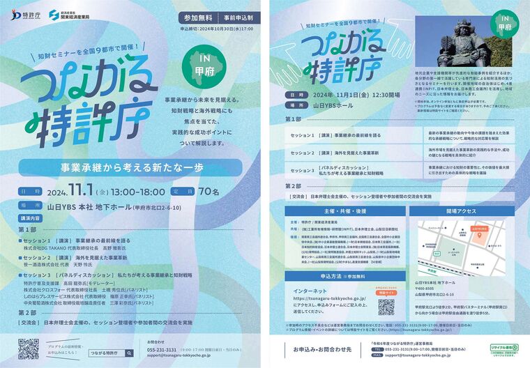 日 時 2024年11月1日(金)13:00-18:00 場 所 山日YBS本社 地下ホール(甲府市北口2-6-10) テ ー マ 事業承継から考える新たな一歩 参加方法 申込フォームから申し込み 定 員 70名 参 加 費 無料 主 催 特許庁 問合せ先 055-231-3131 駐車場のご案内