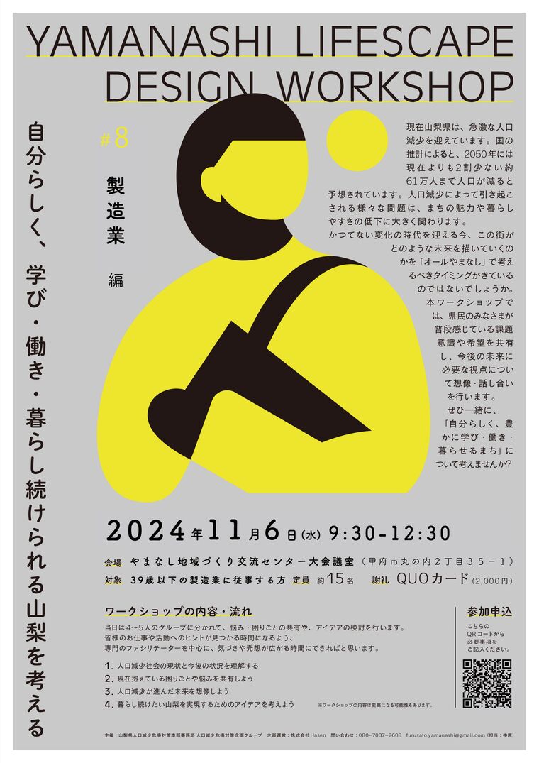 日 時 2024年11月12日(火)14:00-17:00 場 所 やまなし地域づくり交流センター 大会議室(甲府市丸の内2-35-1) テ ー マ 自分らしく、学び・働き・暮らし続けられる山梨を考える 対 象 39歳以下の卸小売業に従事する方 参加方法 フォームから申し込み 定 員 15名 参 加 費 無料 謝 礼 2,000円(QUOカード) 主 催 山梨県人口減少危機対策本部事務局 人口減少危機対策企画グループ