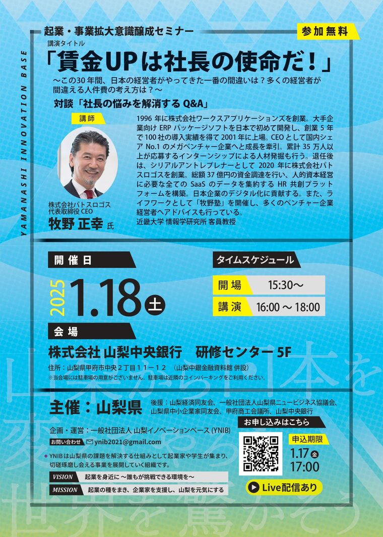 山梨県主催「起業・事業拡大意識醸成セミナー」を1/18(土)開催いたします。「賃金UPは社長の使命だ!」と題し、牧野 正幸さん(株式会社パトスロゴス 代表取締役、元 ワークスアプリケーションズ創業者・代表取締役CEO)を講師に迎え、この30年間、日本の経営者がやってきた一番の間違いは?多くの経営者が間違える人件費の考え方は?などについて熱い講演を予定しています。皆さまのご参加をお待ちしております。