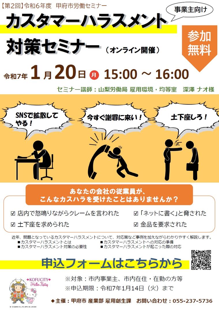甲府市では、労働に関する知識や制度への理解を深め、働きやすい職場環境づくりに役立つように、各種セミナーを開催しています。今回は、近年問題となっているカスタマーハラスメントについて、下記オンラインセミナーを開催します。