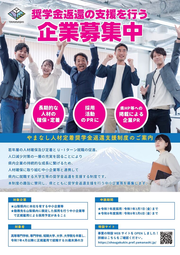 山梨県では、県内企業における若年層の人材確保・定着とUIターン就職の促進及び人口減少対策の一層の充実を図ることにより、県内企業の持続的な成長につなげるため、人材確保に取り組む中小企業と連携して、県内に就職する大学生等の奨学金返還を支援する新たな奨学金返還支援制度を創設しました。本制度の趣旨に賛同し、県とともに奨学金変換支援を行う中小企業等を募集します。