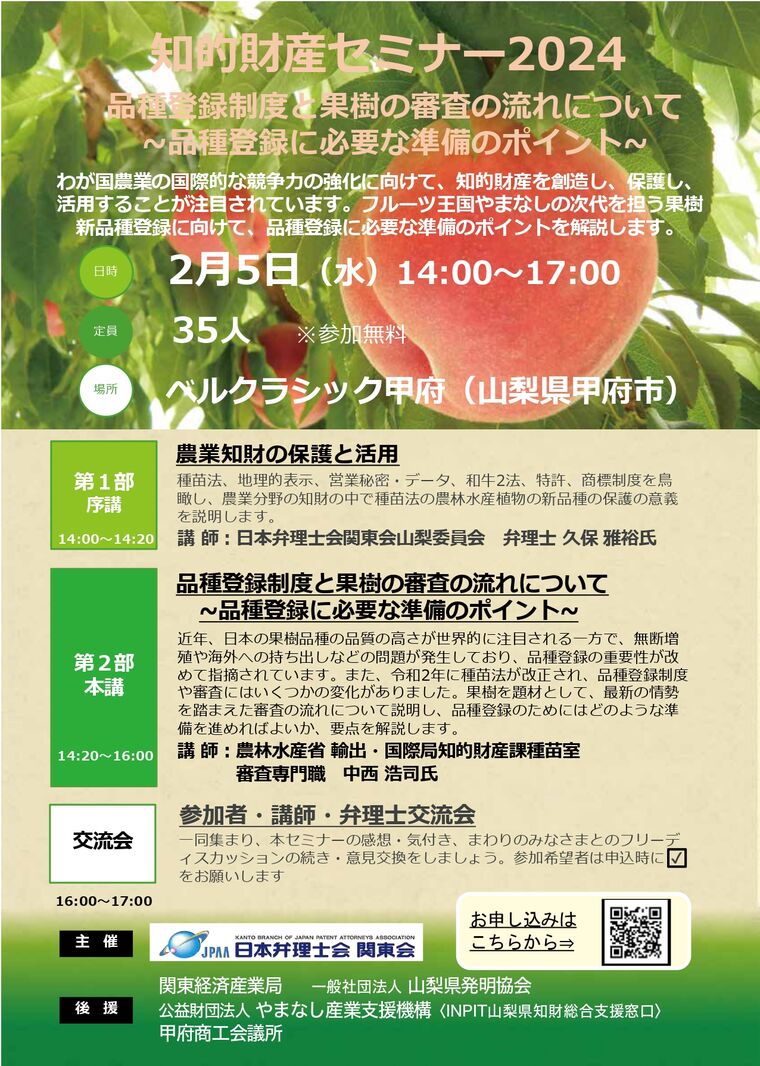 | 問合せ先 | 知的財産セミナー2024運営事務局、日本弁理士会関東会(山梨委員会) 電話番号:03-6811-6170 |