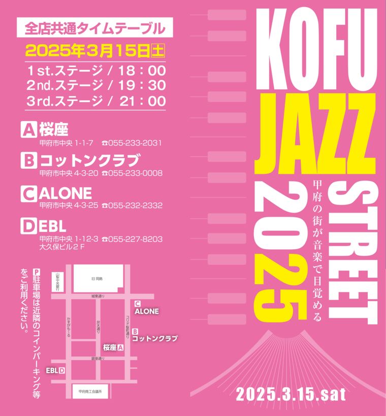4店舗を自由に回って 甲府のまちでジャズを堪能しよう!今年の開催日は3月15日(土)です。開催概要をイベントページに掲載しました。下記のリンクより内容をご確認ください。