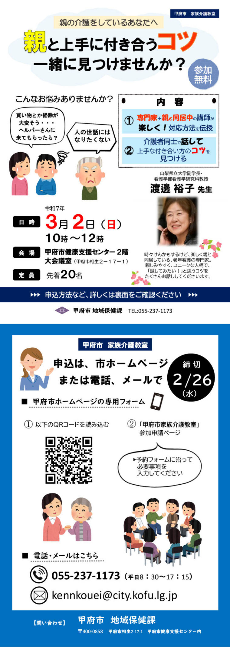 日 時 2025年3月2日(日)10:00~12:00 場 所 甲府市健康支援センター2階大会議室 テ ー マ 親と上手に付き合うコツ一緒に見つけませんか? 講 師 山梨県立大学副学長・看護学部看護学研究科教授 渡邊裕子 先生 参 加 費 無料 定 員 先着20名 申込方法 甲府市HPをご確認ください