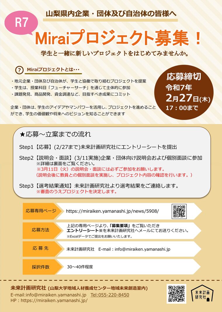 「Mirai プロジェクト」は、 県内の民間企業・団体・自治体が学生と協働で取り組み、地域の未来を探るプロジェクトです。