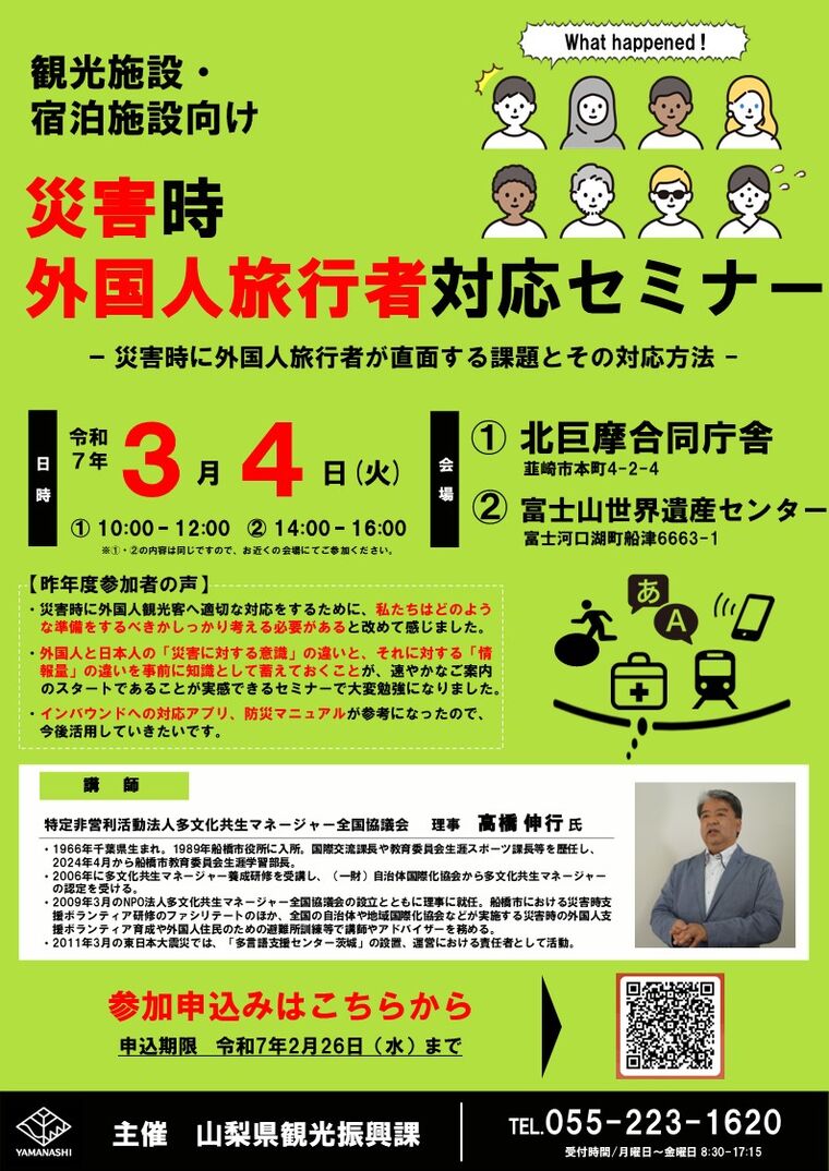 【山梨県】「観光施設・宿泊施設向け災害時外国人旅行者対応セミナー」の開催