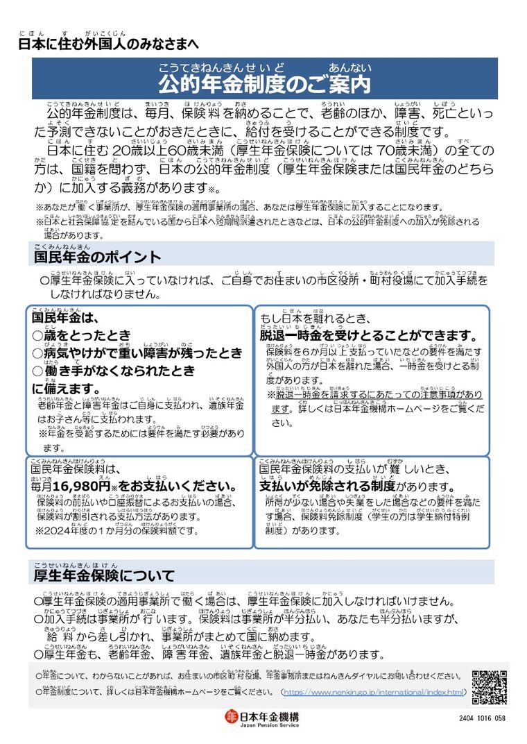 他にも言語や内容が異なるリーフレットがいくつかありますので、必要に応じて日本年金機構HPからダウンロードいただくか、甲府年金事務所にご相談ください。お問い合わせ