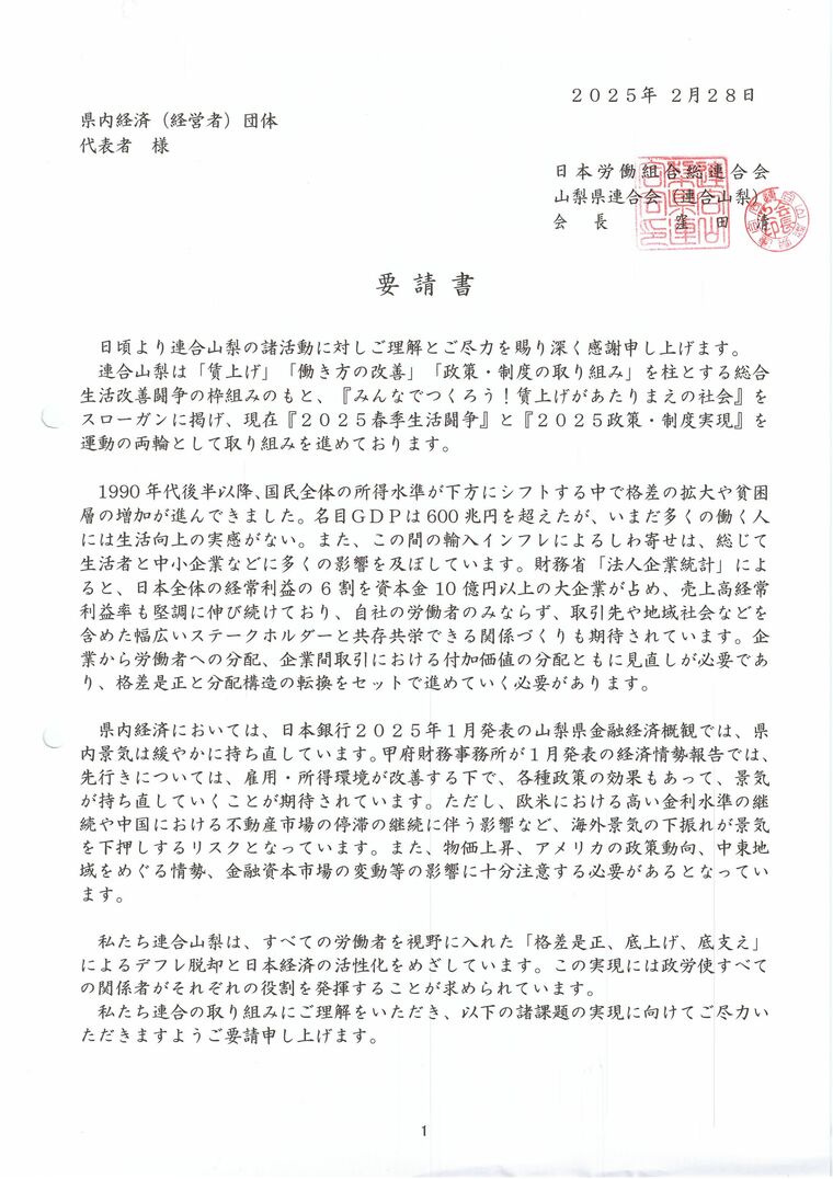 2月28日、連合山梨(窪田 清 会長)より、当所を含む経済4団体宛ての「春季生活闘争に関する要請書」を受領しました。