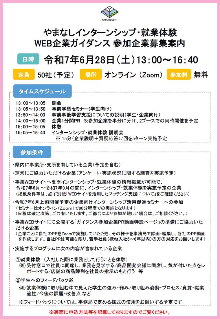 【山梨県】やまなしインターンシップ・就業体験WEB企業ガイダンス参加企業募集のご案内