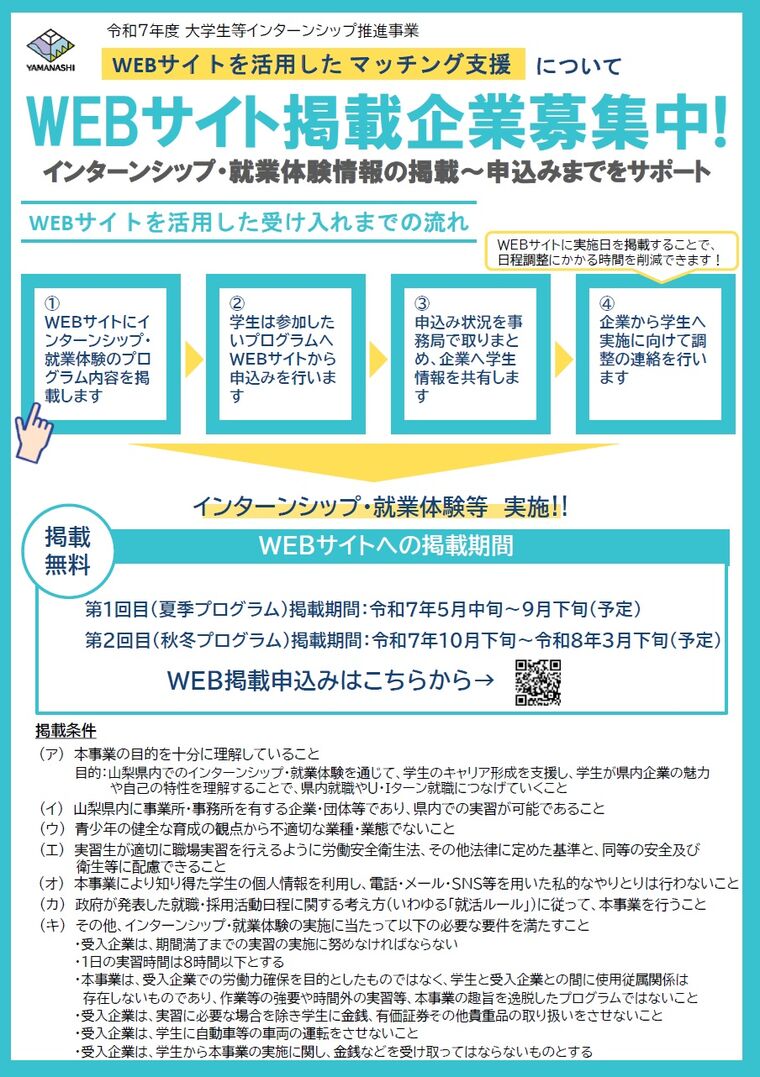 【山梨県】インターンシップ・就業体験情報WEBサイト掲載企業募集