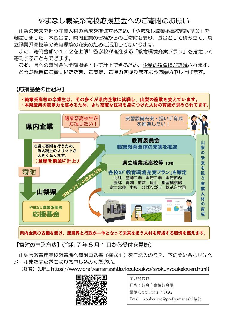 【山梨県教育庁】やまなし職業系高校応援基金へのご寄附のお願い