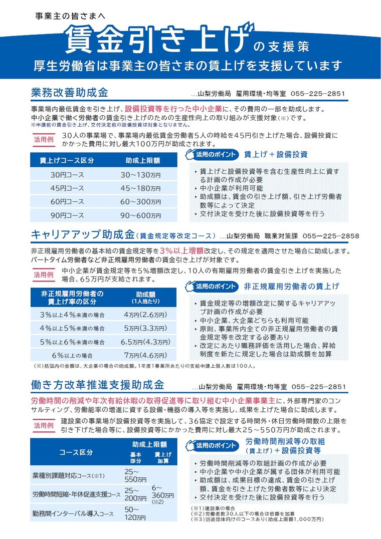 【山梨労働局】賃金引上げの支援策一覧