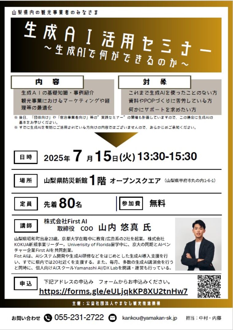 山梨県における観光産業の生産性向上を目的とし、上記の通りセミナーが開催されます。詳細・申込は以下のサイトよりご確認ください。